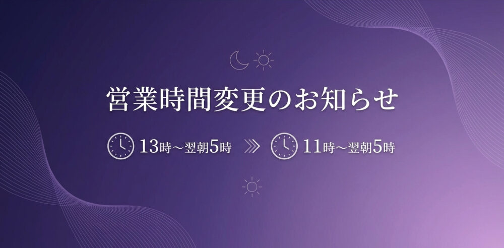 2026年より営業時間が変わります 2025年12月30日 いつもありがとうありがとうございます 2026年1月より営業時間が変わります 12時から翌朝5時まで ↓↓↓↓↓↓↓↓↓ 11時〜翌朝5時 11時…